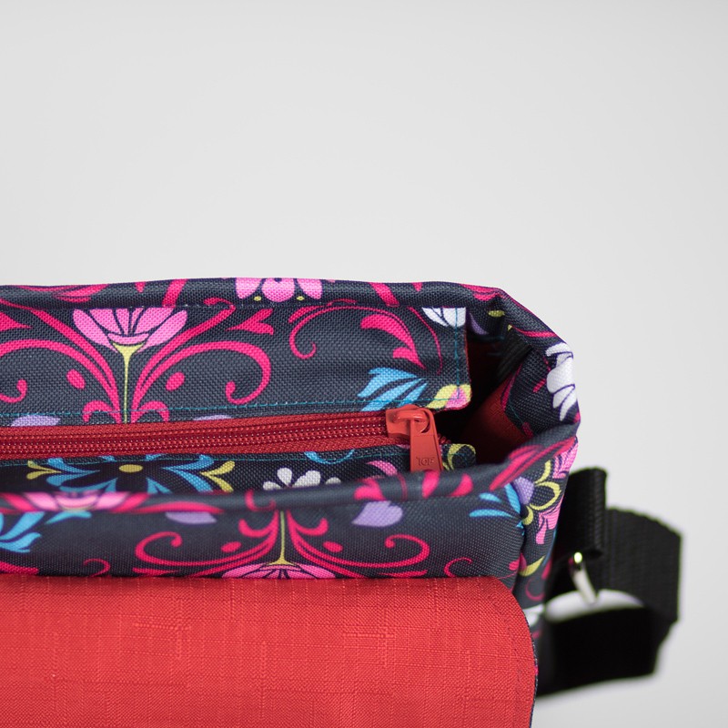 Duża komora torby pomieści format A4. Torba posiada zewnętrzną i wewnętrzną kieszeń na zamek, a na przedniej ściance dodatkowe dwie otwarte kieszenie. Komora torby zapinana jest na zamek, a całość dodatkowo przykrywa klapka z zapięciem na rzepy. Regulowany pasek pozwoli na noszenie torby na ramieniu, a także przewieszoną przez ciało. Miękki naramiennik zwiększa komfort noszenia.