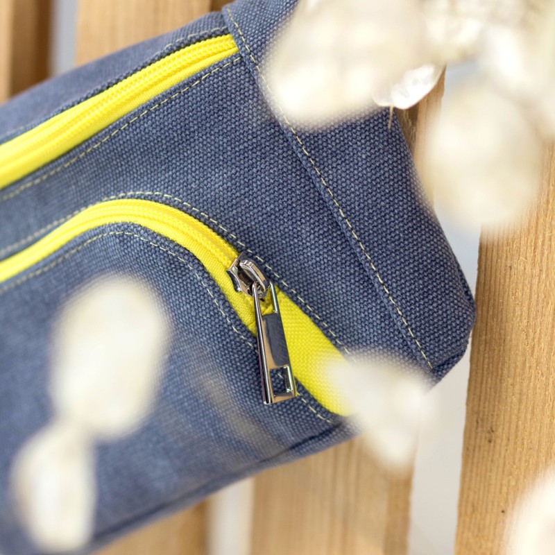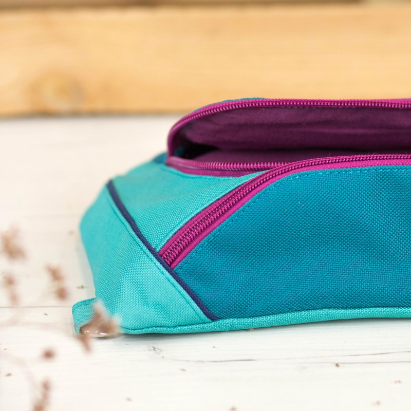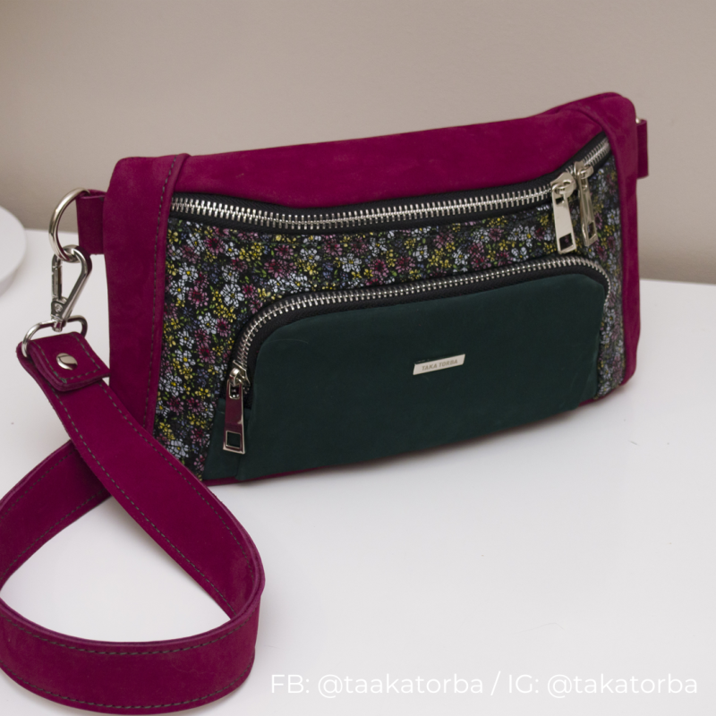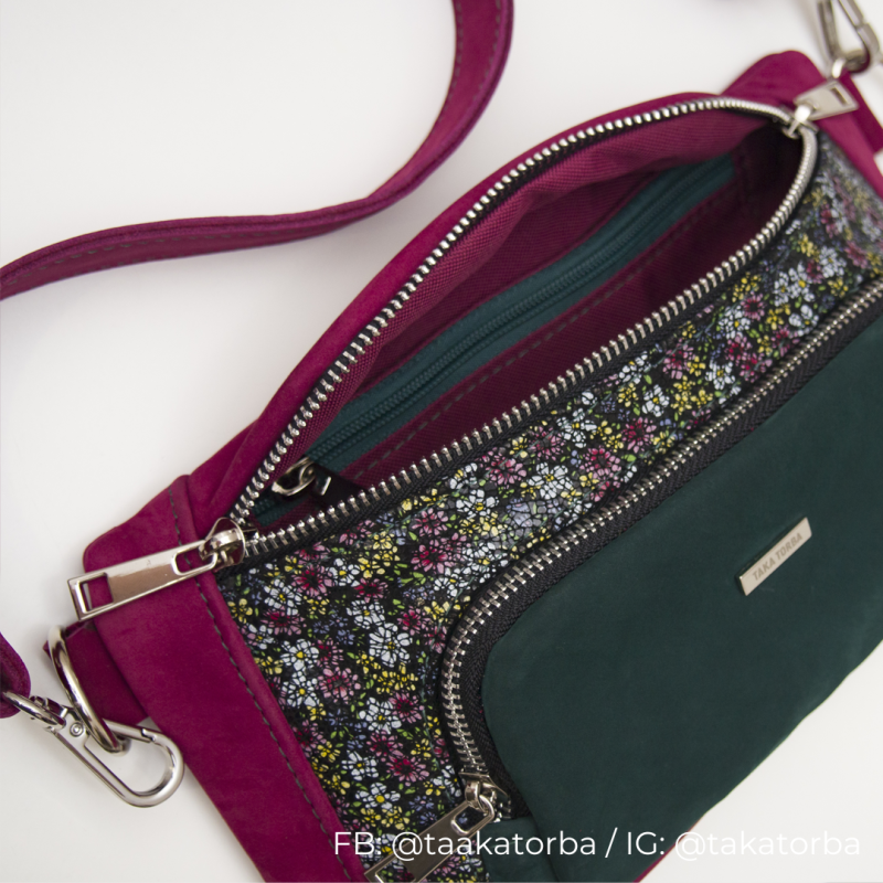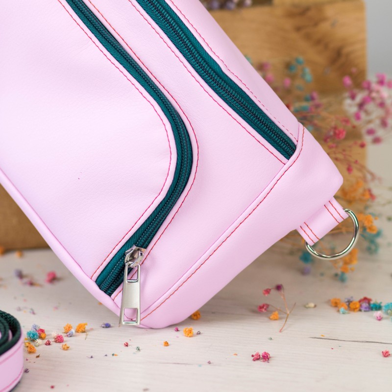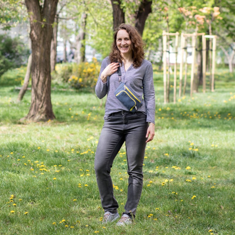 Konstrukcja Hugo wyróżnia się przemyślanymi detalami: odcinane boczki ładnie wykańczają zarówno zamek, jak i klapkę, a uchwyty wszyte w szew boczny dają Ci dodatkowe opcje – możesz łatwo zmienić sposób noszenia nerki, np. dodając szlufki do tylnego panelu i zakładać ją na pasek. Nerka u dołu ma bardzo subtelnie zarysowane dno, które jest częścią panelu tyłu. Dodatkowo przednia kieszeń w tym projekcie jest opcjonalna, możesz ją pominąć i uszyć super prosty i przyjemny model saszetki.